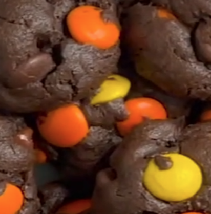 This is a fudgy cookie, made with chocolate chips and Reeses Pieces candies.